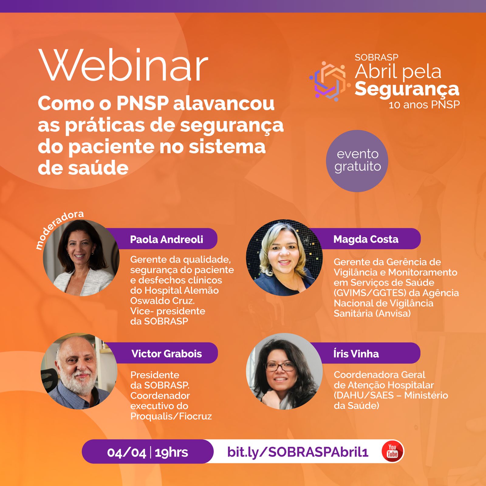Webinar integrante da Programação da SOBRASP da campanha Abril Pela Segurança do Paciente 2023, em comemoração dos 10 anos do Programa Nacional de Segurança do Paciente de Ministério da Saúde do Brasil – PNSP/MS, que tem como tema central "10 ANOS DO PROGRAMA NACIONAL DE SEGURANÇA DO PACIENTE – PNSP – “COMPARTILHAR OS AVANÇOS PARA ACELERAR AS MUDANÇAS”.